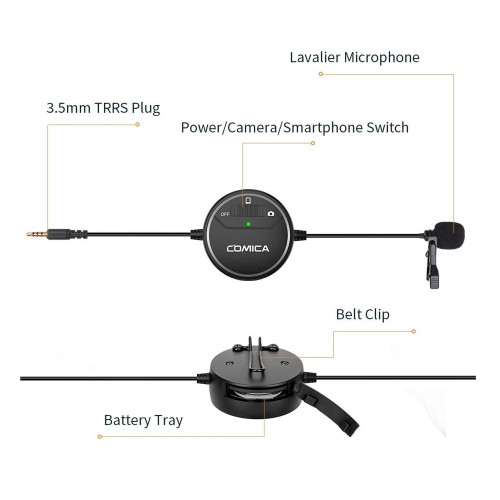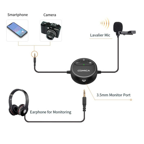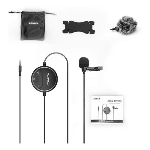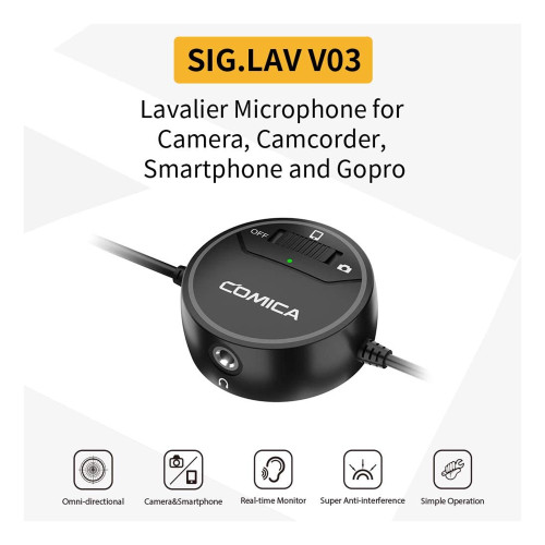 میکروفون Comica مدل Audio SIG.LAV V03 یک میکروفون یقه ای با الگوی دریافت 360 درجه ای است. با استفاده از این میکروفون، علاوه بر امکان مانیتورینگ در حین ضبط صدا، می توانید یک ضبط دقیق و واضح بصورت مستقیم با دوربین DSLR/ mirrorless و ضبط کننده های صوتی تان داشته باشید. همچنین می توانید میکروفون SIG.LAV V03 را با گوشی های هوشمند و تبلت های اندرویدی و آیفون، مجهز به جک هدفون استفاده نمائید. کابل 6.2 متری این میکروفون دارای یک ماژول دایره ای شکل به همراه یک گیره برای اتصال به کمربند شما است. بر روی این ماژول، یک خروجی صدای 3.5 میلیمتری وجود دارد که می توانید با اتصال آن به گوشی های هوشمند از قابلیت مانیتورینگ در لحظه استفاده کنید. همچنین یک سوئیچ اختصاصی بر روی این قسمت وجود دارد که دو حالت: خروجی دوربین یا خروجی گوشی هوشمند دارد که خروجی میکروفون را به جک 3.5 میلیمتری TRS یا TRRS تغییر می دهد. این میکروفون دارای الگوی دریافت صدای 360 درجه ای است که صدا را از همه جهات دریافت می کند و می تواند آزادی حرکت را برای شما فراهم کند، حتی زمانیکه که سوژه شما از میکروفون دور می شود. توان مورد نیاز این میکروفون توسط یک باتری CR2032 تأمین می‌شود. همچنین ساختار فلزی این میکروفون، حفاظت الکترومغناطیسی خوبی در برابر نویز های RF ایجاد می کند و پاپ فیلتر فومی آن هم از نویزهای ایجاد شده توسط صدای باد محافظت می کند.
